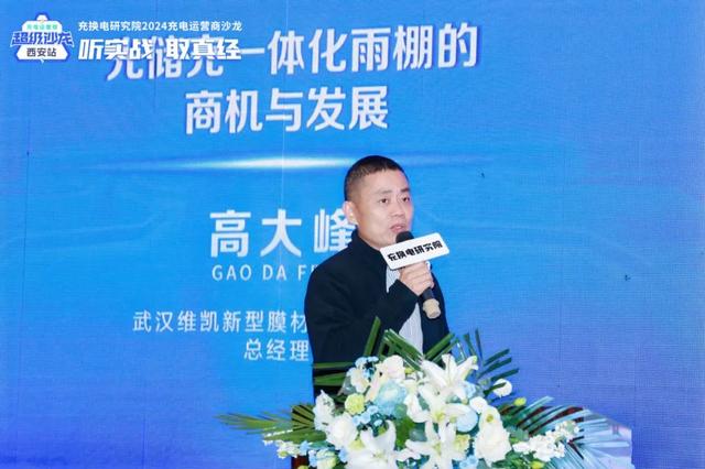 在场站配套层面,无论是从基础的功能考虑,还是基于光储充站的发展趋势,车棚对于充电站的重要性愈加重要。武汉维凯新型膜材料有限公司总经理高大峰从《光储充一体化雨棚的商机与发展》主题出发,针对行业现状、解决方案、服务案例以及企业实力四个层面做了详细分享。