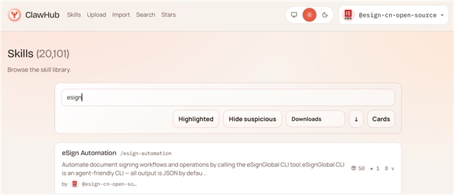 用户可在clawhub/github直接搜索找到esign-automation。